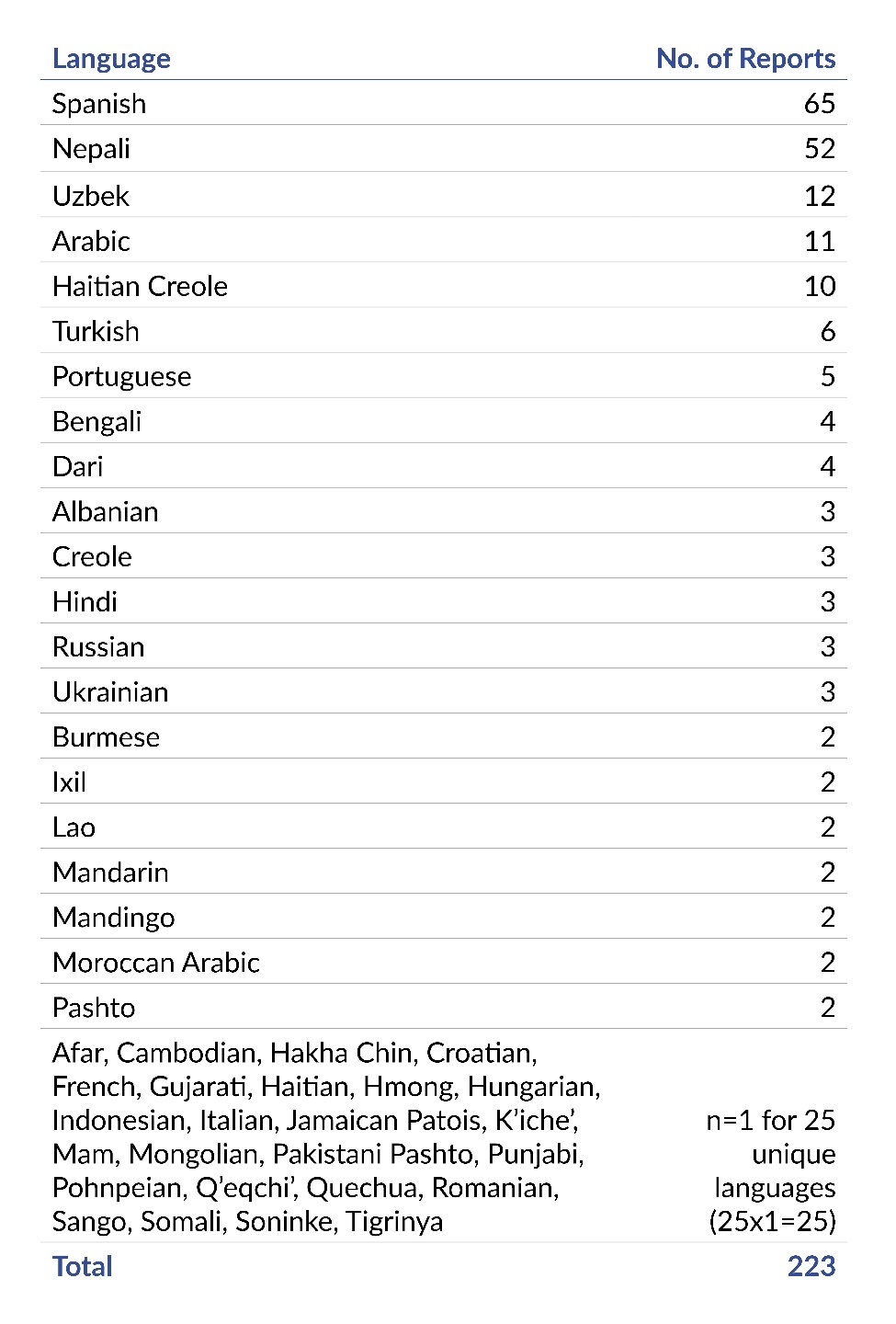 The patient’s native language was included in 223 reports, with a total of 46 languages reported. Two languages, Spanish and Nepali, make up over half (52.5%; 117 of 223) of these reports. The frequency of each language is shown in Table 1.
