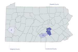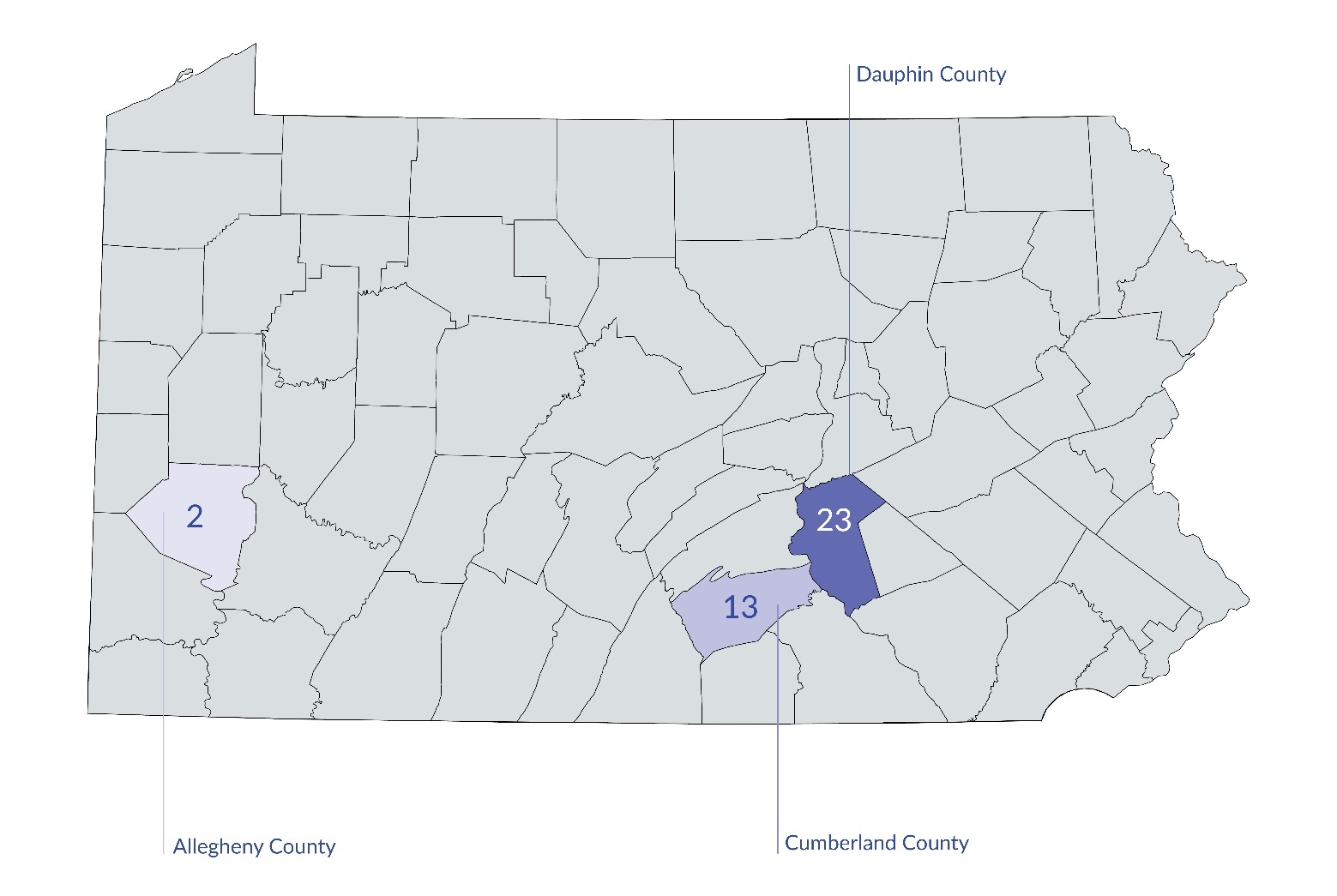 We analyzed the interpretation challenges to determine if there were predominant languages that were associated with these events. Nepali was the most frequently reported language in reports that mentioned interpretation was not available (24.1%; 38 of 158). Furthermore, a large proportion of events where a Nepali interpreter was not available was concentrated in two contiguous Pennsylvania counties, Dauphin and Cumberland, as shown in Figure 2. When interpretation services were available, but not offered/not used, the most frequently reported native language of the patient was Spanish (44.1%; 15 of 34) and these were distributed across 10 counties.