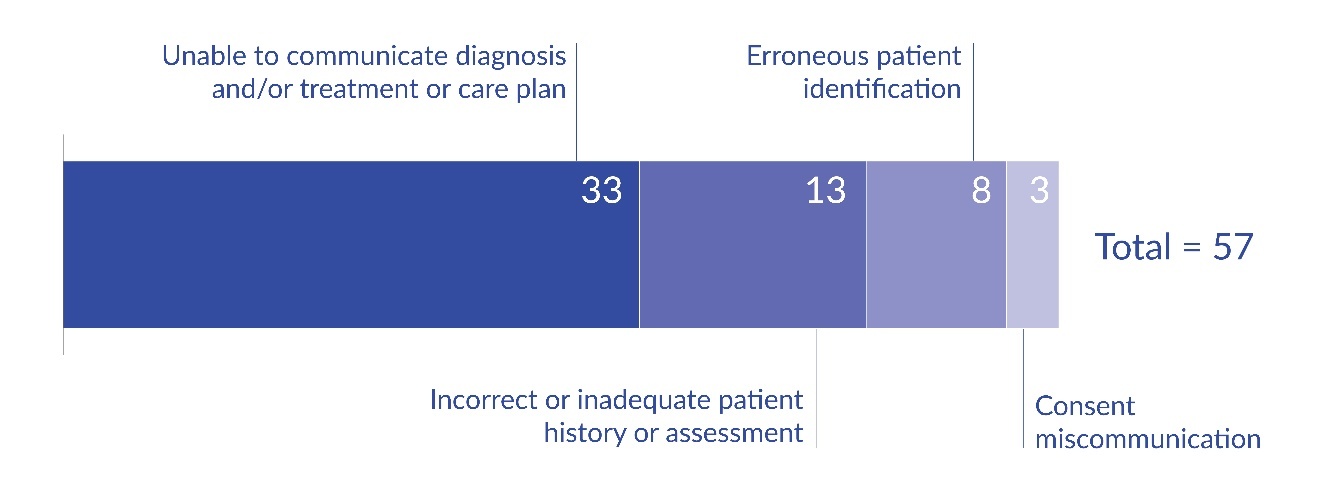 A language barrier was associated with clinical process issues in 57 reports. Figure 3 shows that over half (57.9%; 33 of 57) of reports indicated that the language barrier was associated with a provider being unable to communicate diagnosis and/or treatment or care plan.
