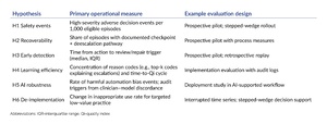 ESM is proposed as a testable theory of safe action under uncertainty. The hypotheses in Table 1 can be assessed in settings with or without clinical AI, using routinely collected outcome data and safety monitoring.