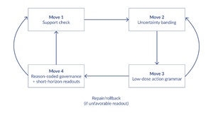 Once uncertainty is explicit, ESM applies a low-dose action grammar: choose the smallest action that (a) is plausibly beneficial, (b) generates interpretable information within a short horizon, and (c) remains easy to stop or reverse if the trajectory is unfavorable. The grammar is not anti-treatment; it is pro-recoverability. In oncology, dose and schedule often matter as much as drug identity, and combination therapy can confer benefit via patient-to-patient variability even without drug synergy.8–10 ESM generalizes this logic beyond oncology: It favors microsteps, rapid readouts, and default reversibility.